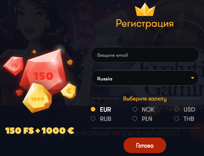 Кристалики слева от формы заполнения дают понять, что каждый новый клиент вправе получить до 150 бесплатных вращений и до 1000 евро (или эквивалент в валюте другого государства).