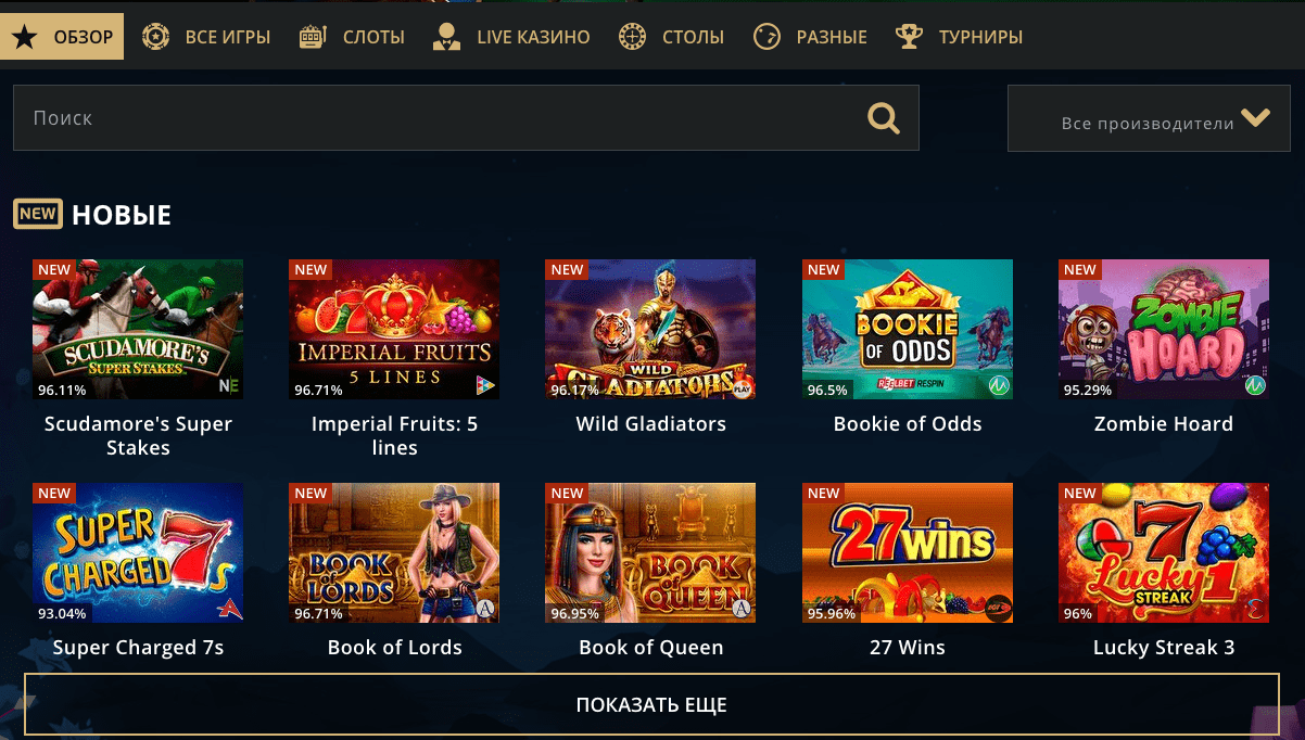 Широко представлены игровые автоматы. Они удобно распределены по жанрам, популярности, и новизне.